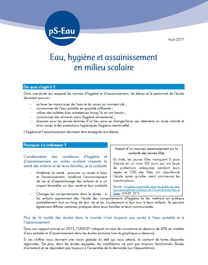C'est pourquoi, le pS-Eau vous propose de la documentation pour mieux comprendre pourquoi et comment agir pour l'eau, l'hygiène et l'assainissement en milieu scolaire.