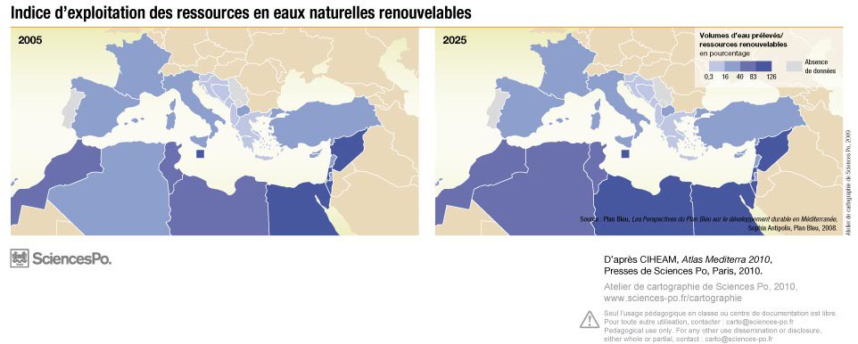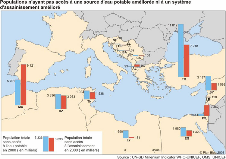 Aujourd’hui en Méditerranée, 180 millions de personnes disposent de moins de 1000 m3 d’eau. Selon les prévisions du Plan Bleu, «les pressions sur les ressources en eau s’accroîtront encore de façon sensible au Sud et à l’Est et 63 millions de Méditerranéens disposeront de moins de 500 m3 d’eau par habitant par an (seuil considéré de “pénurie”) à l’horizon 2025.