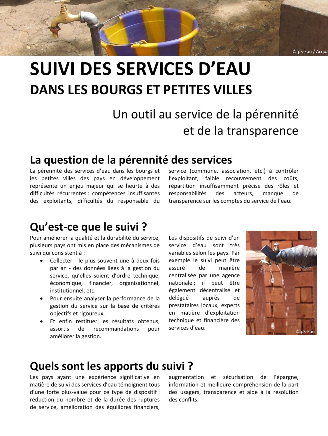 - Une note de synthèse "Les services d'eau dans les petits centres" qui caractérise ces localités et leurs enjeux spécifiques, notamment en terme de suivi et de régulation.