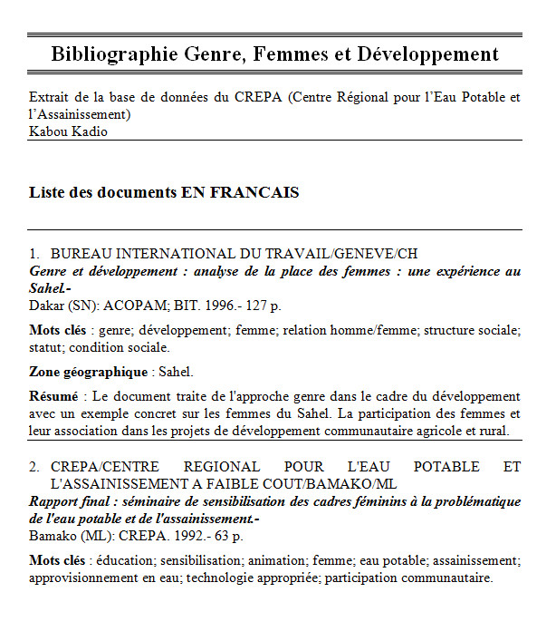 Bibliographie Genre, Femmes et Développement revue - 2002 - 7 pp Ed. EAA - Ouagadougou |