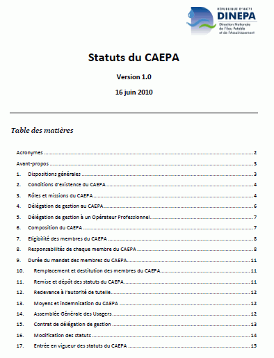 Statuts CAEPA : Comité d'Approvisionnement en Eau Potable et d'Assainissement