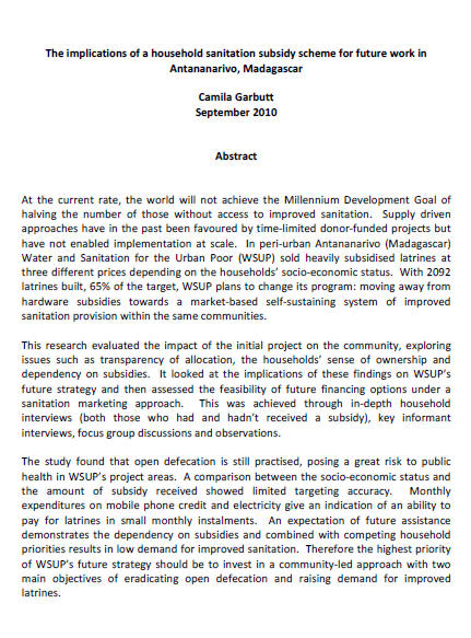 The implications of a household sanitation subsidy scheme for future work in Antananarivo