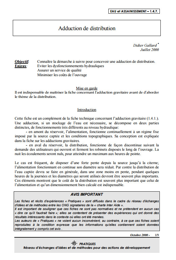 L'adduction: quelques principes concernant le fonctionnement et le dimensionnement