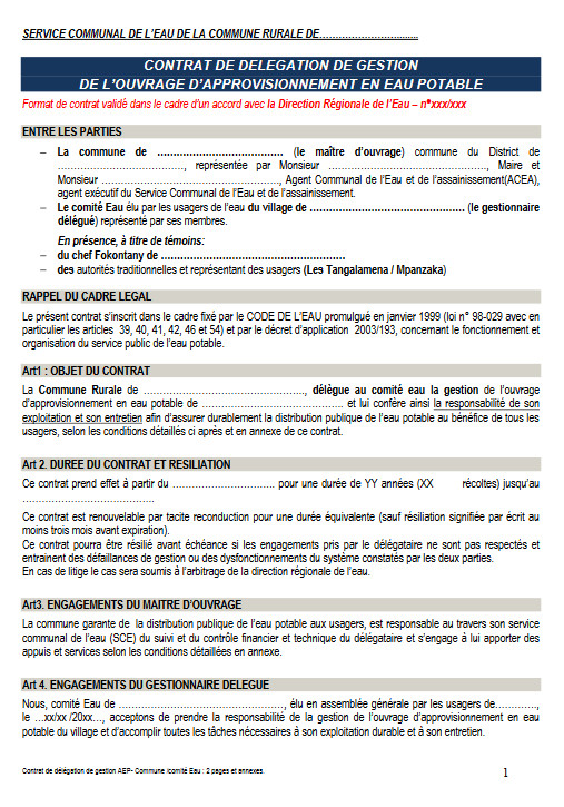 Contrat de délégation de gestion de l'ouvrage d'approvisionnement en eau potable