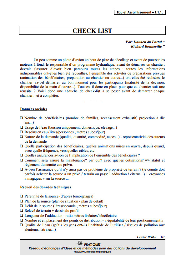 Généralités sur les préalables et l'organisation d'un chantier d'adduction gravitaire : check-list