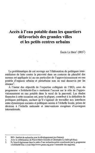 Accès à l'eau potable dans les quartiers défavorisés des grandes villes et les petits centres urbains rapport - 2002 - 14 pp Ed. IRD - Marseille |