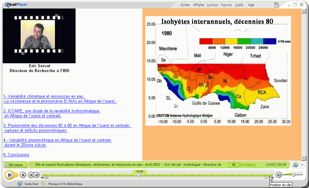 Variabilité climatique, sécheresse, et ressources en eau en Afrique de l'Ouest Conférence par Eric Servat (IRD) Département milieux et environnement (DME) R050 - Hydrosciences (HSM) 16 avril 2003 film video internet - 2003 - 32 mn Ed. IRD - Marseille |