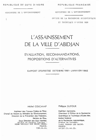 L'assainissement de la ville d'Abidjan : évaluation, recommandations, propositions d'alternatives : rapport d'expertise octobre 1981-janvier 1982 rapport - 1982 - 300 pp Ed. IRD - Marseille |