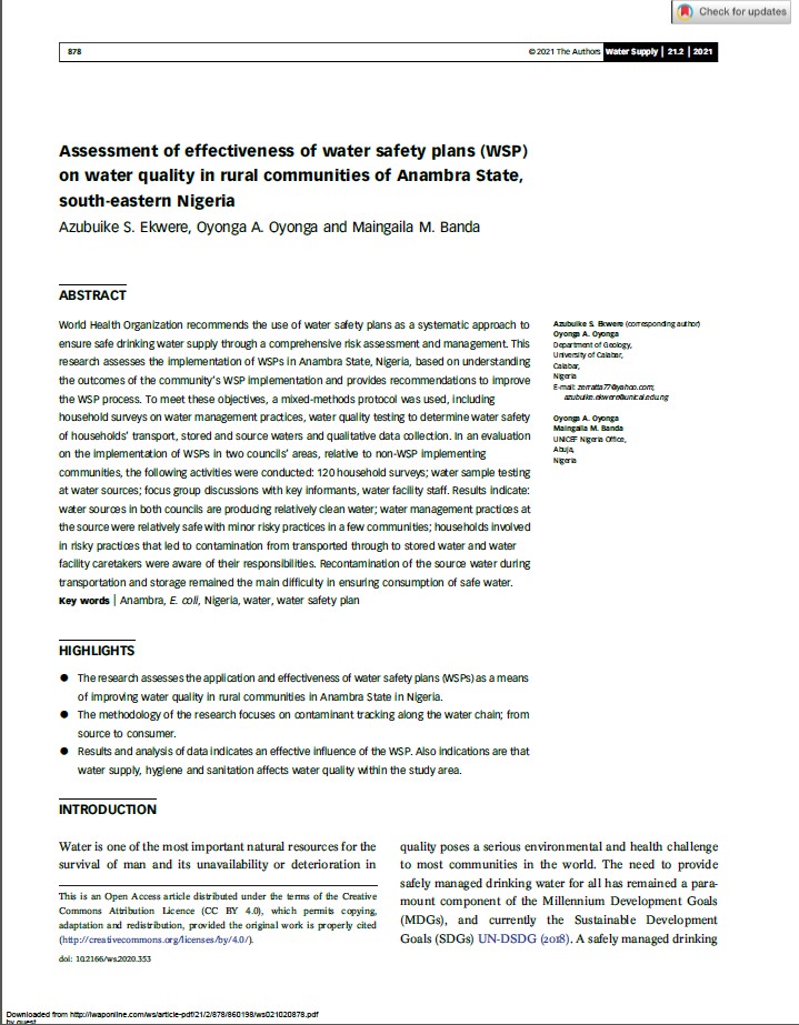 Assessment of effectiveness of water safety plans (WSP) on water quality in rural communities of Anambra State, south-eastern Nigeria