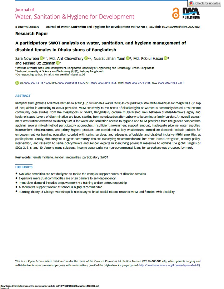 Une analyse SWOT participative sur la gestion de l'eau, de l'assainissement et de l'hygiène des femmes handicapées dans les bidonvilles de Dhaka au Bangladesh