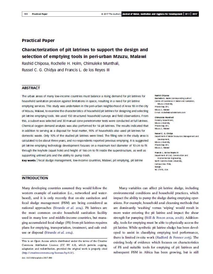 Caractérisation des fosses de latrines pour appuyer la conception et la sélection d'outils de vidange dans la périphérie urbaine de Mzuzu, Malawi