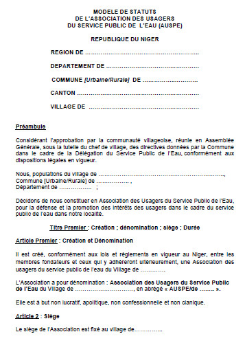 Modèle de statuts et du règlement intérieur de l'Association des Usagers du Service Public de l'Eau (AUSPE), Niger