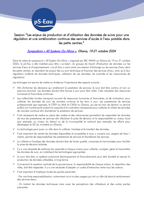 Comprendre, mettre en place et utiliser les mécanismes de suivi pour renforcer la qualité des services d’eau et contribuer à leur régulation