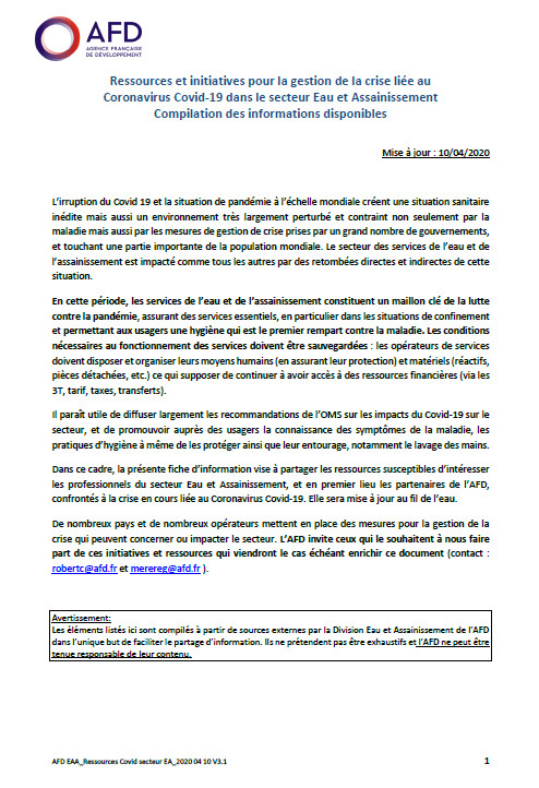 Ressources et initiatives pour la gestion de la crise liée au Coronavirus Covid-19 dans le secteur Eau et Assainissement -