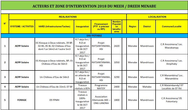 Acteurs et zone d'intervention 2018 du MEEH/ DREEH Menabe