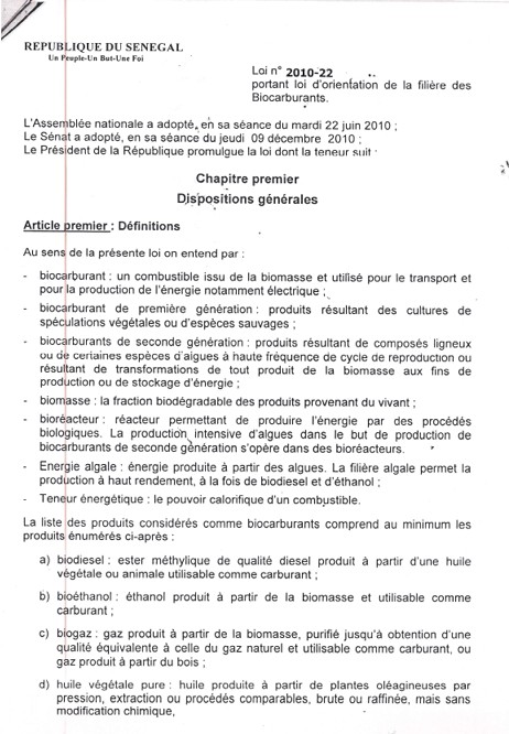 Loi n°2010-22 portant loi d'orientation de la filière des Biocarburants