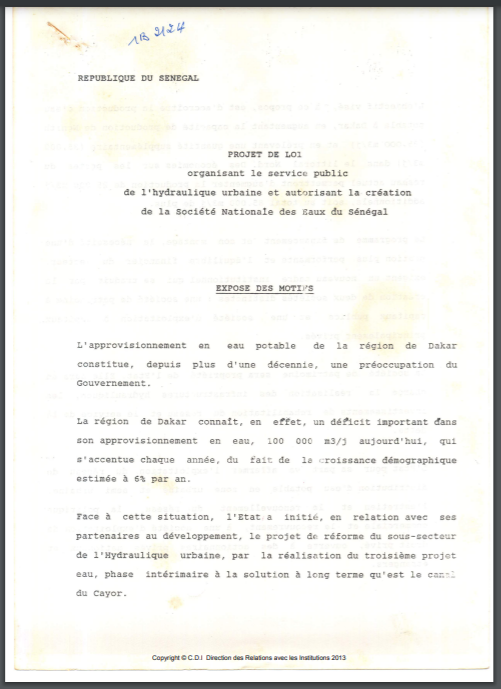 Projet de loi portant création de la Société Nationale des Eaux du Sénégal