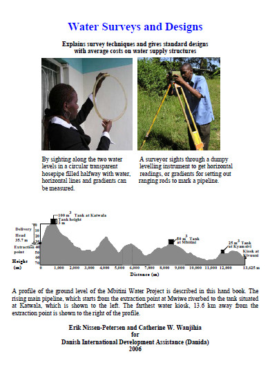 Water Surveys and Designs Explains survey techniques and gives standard designs with average costs on water supply structures manuel - 2006 - 66 pp Ed. Water for Arid Land - Nairobi |