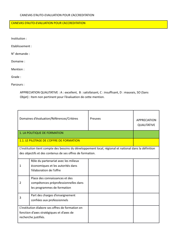 CANEVAS D'AUTO-EVALUATION POUR L'ACCREDITATION