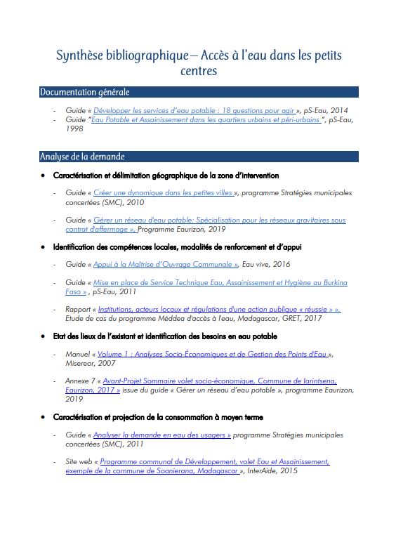 Synthèse bibliographique - Accès à l'eau dans les petits centres