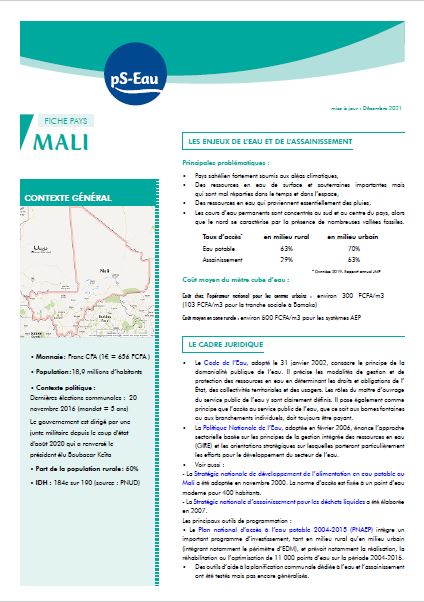 note coll. Fiche-Pays Jan 2021 ; 2 pages Aut. Guillaume Aubourg Ed. pS-Eau - Paris - 2021 édition Téléchargeable sous format: PdF Résumé: Cette fiche constitue une synthèse du contexte vis-à-vis de l'eau et l'assainissement au Mali, présentant les chiffres clés, les principales problématiques, le cadre règlementaires et les institutions, les mode de gestion des services. Public-Cible:
