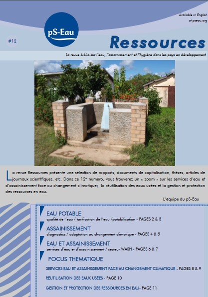 revue documentaire, bibliographie coll. Ressources n° 12 Feb 2023 ; 12 pages Aut. Mélodie Boissel & Christophe Le Jallé & Ed. pS-Eau - Paris Téléchargeable sous format: PdF Page de présentation d'un éditeur Résumé: La revue Ressources présente une sélection de rapports, documents de capitalisation, thèses, articles de journaux scientifiques, etc. Dans ce 12e numéro, vous trouverez un « zoom » sur les services d’eau et d’assainissement face au changement climatique; la réutilisation des eaux usées et la gestion et protection des ressources en eau. Abstract: This edition of Resources contains a selection of reports, knowledge management documents, scientific journal articles, etc. that pS-Eau has collated over the last few months. This 12th issue focuses on wa-ter resource management and protection, WASH services and climate change and wastewater treatment and reuse. We hope you find it informative and useful.