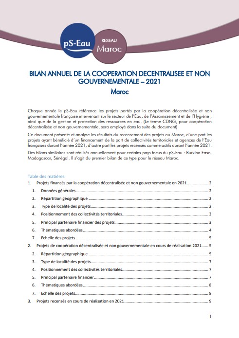 lettre d'information Dec 2022 ; 10 pages Aut. Mélodie Boissel Ed. pS-Eau - Paris Téléchargeable sous format: PdF Résumé: haque année le pS-Eau référence les projets portés par la coopération décentralisée et non gouvernementale française intervenant sur le secteur de l’Eau, de l’Assainissement et de l’Hygiène. Ce document recense les projets au Maroc, ayant bénéficié d’un financement de la part de collectivités territoriales et agences de l’Eau françaises et ayant débuté durant l’année 2021; ainsi que les projets en cours de réalisation cette année là.