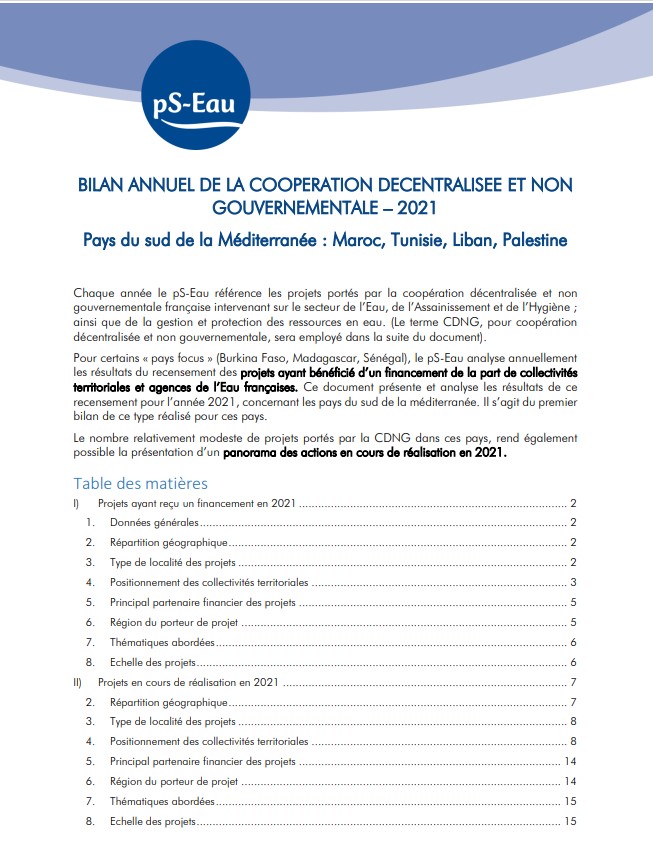 Chaque année le pS-Eau référence les projets portés par la coopération décentralisée et non gouvernementale française intervenant sur le secteur de l’Eau, de l’Assainissement et de l’Hygiène. Ce document recense les projets dans les pays du sud du bassin méditerranéen, Maroc, Tunisie, Liban, Palestine, ayant bénéficié d’un financement de la part de collectivités territoriales et agences de l’Eau françaises et ayant débuté durant l’année 2021; ainsi que les projets en cours de réalisation cette année là.