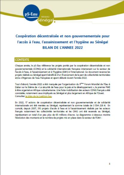 Chaque année le pS-Eau référence les projets portés par la coopération décentralisée et non gouvernementale française intervenant sur le secteur de l’Eau, de l’Assainissement et de l’Hygiène. Ce document recense les projets au Sénégal, ayant bénéficié d’un financement de la part de collectivités territoriales et agences de l’Eau françaises et ayant débuté durant l’année 2022; ainsi que les projets en cours de réalisation cette année là.
