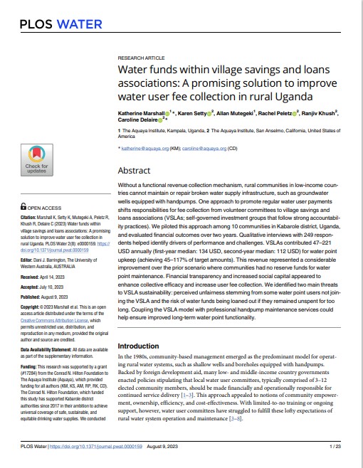 Water funds within village savings and loans associations: A promising solution to improve water user fee collection in rural Uganda | ||||||||