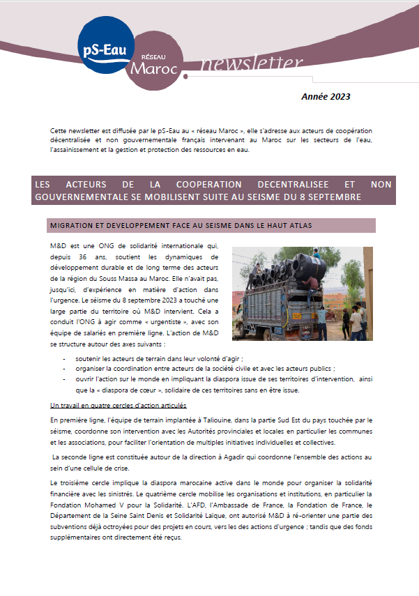 lettre d'information coll. Lettre Maroc n° 202312 Dec 2023 ; 12 pages Aut. Mélodie Boissel & Ed. pS-Eau - Paris Téléchargeable sous format: PdF Résumé: Cette newsletter est diffusée par le pS-Eau au « réseau Maroc », elle s’adresse aux acteurs de coopération décentralisée et non gouvernementale français intervenant au Maroc sur les secteurs de l’eau, l’assainissement et la gestion et protection des ressources en eau.