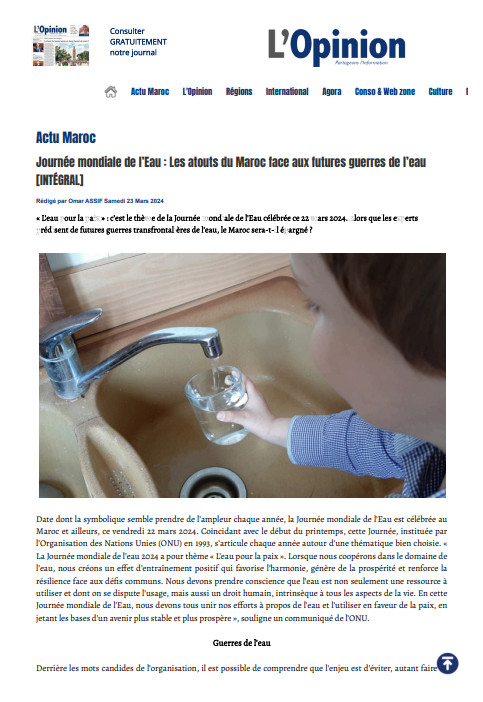 article de presse Mar 2024 ; 4 pages Aut. Laila Mandi & Omar Assif Ed. L'opinion - Téléchargeable sous format: PdF Téléchargeable chez l'éditeur Résumé: « L’eau pour la paix » : c’est le thème de la Journée mondiale de l’Eau célébrée ce 22 mars 2024. Alors que les experts prédisent de futures guerres transfrontalières de l’eau, le Maroc sera-t-il épargné ?