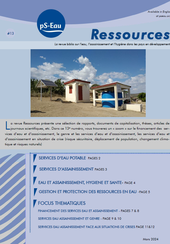 revue documentaire, bibliographie Jan 2024 ; 12 pages Aut. Mélodie Boissel Ed. pS-Eau - Paris Téléchargeable sous format: PdF Résumé: L a revue Ressources présente une sélection de rapports, documents de capitalisation, thèses, articles de journaux scientifiques, etc. Dans ce 13e numéro, vous trouverez un « zoom » sur le financement des services d’eau et d’assainissement, le genre et les services d’eau et d’assainissement, les services d’eau et d’assainissement en situation de crise (risque sécuritaire, déplacement de population, changement climatique et risques naturels)
