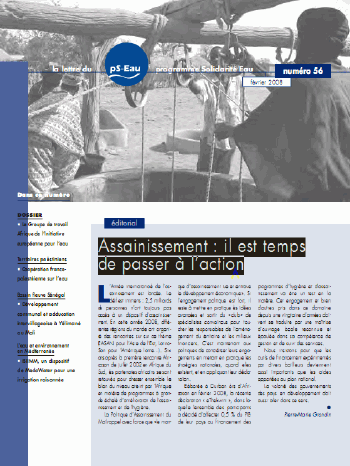 Assainissement : il est temps de passer à l'action lettre d'information coll. Lettre du pS-Eau n° 56 Feb 2008 ; 16 pages Ed. pS-Eau - Paris Téléchargeable sous format: PdF Sommaire: EDITORIAL de PM. Grondin: Assainissement: il est temps de passer à l'action ----------------------------------------------------------------- ----------------------------------------------------------------- 1_ RENCONTRES, EVENEMENTS ----------------------------------------------------------------- L'Initiative européenne pour l'eau: Une plateforme commune entre Etats, institutions internationales et société civile. Un partenariat stratégique Afrique-UE pour l'eau et l'assainissement a été lancé à Johannesburg en 2002. Il est depuis mis en œuvre par la composante Afrique de l'Initiative européenne pour l'eau (EU Water Initiative, EUWI). Son but est d'apporter une contribution effective à l'atteinte des OMD pour l'eau et l'assainissement. Résumé des initiatives conduites en 2007 et perspectives 2008. ©Véronique Verdeil & Christophe Le Jallé & Bruno Valfrey-Visser & Andy Cotton "Gestion intégrée de la ressource et coopération": Une rencontre initiée par l'Arene IDF, partenaire du pS-Eau © Denis Dangaix & Sarah Gillet AfricaSan 2008 : L'assainissement, une priorité pour l'Afrique Le groupe de travail Finance (GTF) de l'Initiative européenne, partenaire du GTA © Vanessa Celosse ----------------------------------------------------------------- 2_ EAU POTABLE ET ASSAINISSEMENT : ----------------------------------------------------------------- page 7 » Coopération décentralisée franco-palestinienne: De l'eau… au développement local La ville de Tubas, au nord-est de la Cisjordanie, connaît de graves problèmes d'alimentation en eau potable. L'Association de coopération entre acteurs du développement (ACAD), les communes de Saint-Pierre d'Aurillac, Fargues de Langon en Gironde, l'Agence de l'eau Adour Garonne et la commune palestinienne de Tubas unissent leurs efforts depuis 2006 pour améliorer cette situation préoccupante. © Mireille Murawski & Alain Dutemps ----------------------------------------------------------------- 3_ BASSIN DU FLEUVE SENEGAL: ----------------------------------------------------------------- page 10 » Migrants, municipalité, SEDIF et Véolia Waterdev: une logique de mutualisation: Le Paddy (programme d'appui au développement durable) de Yélimané au Mali. Depuis plus de vingt ans, la ville de Montreuil mène une politique de coopération avec le cercle de Yélimané, dans la région de Kayes, au Mali. Avec les associations de ressortissants maliens de la ville, la municipalité a créé en octobre 2004 le Programme d'appui au développement durable de Yélimané, le Paddy. Celui-ci entend lutter contre la pauvreté, améliorer la sécurité alimentaire et les conditions de vie des populations locales. © Isabelle Vulliez & Frédérique Héry ----------------------------------------------------------------- 4_ MEDITERRANEE ----------------------------------------------------------------- page 12 » Un nouveau dispositif pour la gestion d'une irrigation raisonnée: ISIIMM, un programme euro-méditerranéen de MedaWater. «Développer une gestion intégrée et équilibrée des ressources en eau et de son utilisation, en respectant l'environnement, pour une agriculture irrigable économiquement viable», tel est le concept qui a servi de base à l'élaboration du projet « Innovations sociales et institutionnelles dans la gestion de l'irrigation en Méditerranée » (ISIIMM) porté par Agropolis International (France), en collaboration avec des agriculteurs, des professionnels du développement et autres acteurs du secteur de l'eau. © Michel Soulié ----------------------------------------------------------------- 5_ INFOS ACTUALITES ----------------------------------------------------------------- - Première édition de la Semaine africaine de l'eau Tunis du 26 au 28 mars 2008. - Info multimédia: www.mdgmonitor.org : Un nouveau site sur les Objectifs du Millénaire. - Info vidéos: Au-delà de l'eau - Film de Didier Bergounhou - Info formations: Atelier international pour les jeunes chercheurs en environnement - Paris - 12 au 16 mai 2008. - Info exposition: Les défis de l'eau: Du 29 janvier au 26 avril 2008, au Pavillon de l'eau. - Info lectures: Le Monde Arabe face au défi de l'eau : enjeux et conflits - Info lectures: Guide Macrophytes : recommandations techniques pour la conception et la réalisation des filtres plantés de roseaux. - Info lectures: Les modes de gestion des services d'eau potable en milieu rural - Concertation régionale en Artois / Nord Pas de Calais: Coopération internationale eau et assainissement : enjeux et pratiques, des outils pour agir.