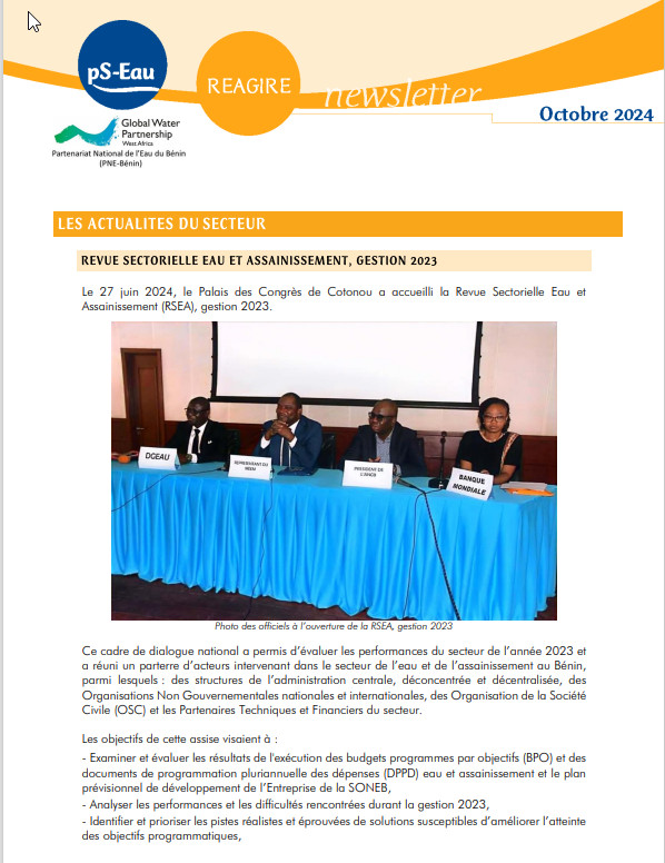 lettre d'information coll. Réagire-Bénin n° 202410 Oct 2024 ; 10 pages Ed. PNE-Bénin - Cotonou pS-Eau - Paris REAGIRE - Cotonou Téléchargeable sous format: PdF Publics-Cibles: Collectivité , Association , Université , Acteurs de coopération , Décideurs locaux ou nationaux