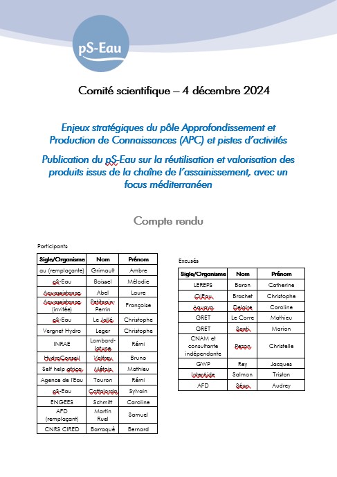 rapport Dec 2024 ; 5 pages Aut. Mélodie Boissel Ed. pS-Eau - Paris Téléchargeable sous format: PdF Résumé: Lors de cette séance, ✔ Le pS-Eau est revenu sur les éléments débattus lors de la précédente séance, qui avait porté sur la stratégie et le plan d’action du pôle Approfondissement et Production de Connaissances (APC). Une synthèse des enjeux stratégiques identifiés a été partagée, ainsi que des pistes d’activités pour les années 2025 à 2027. ✔ Le pS-Eau a présenté la structure et le contenu de la publication en cours d’élaboration « la réutilisation et valorisation des produits issus de a chaîne de l’assainissement, possibilités et enjeux – focus sur le contexte méditerranéen », afin de recueillir des réactions et suggestions.