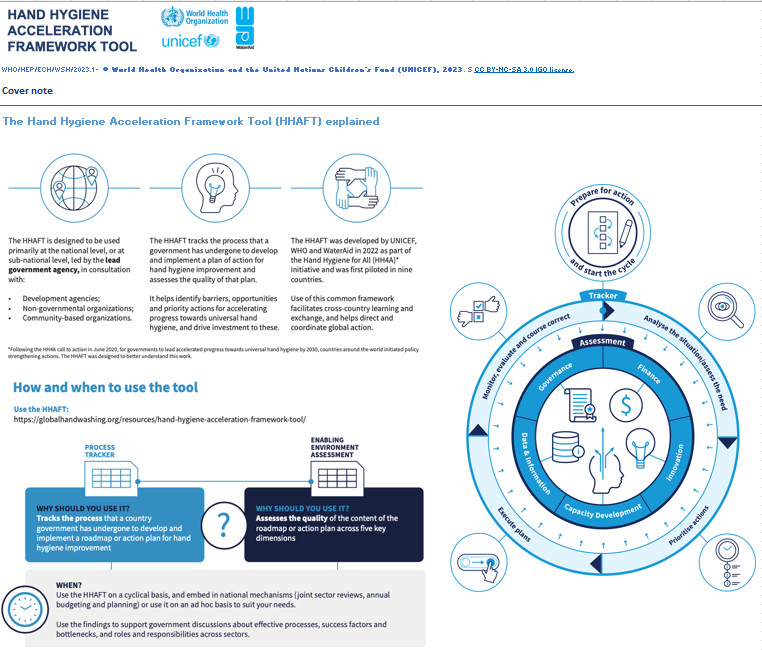 Hand Hygiene Acceleration Framework Tool (HHAFT) Herramienta del Marco de Aceleración de la Higiene de las Manos (HHAFT) outil d'aide à la décision Nov 2022 ; 1 pages; format: excel Ed. WHO - Genève Téléchargeable sous format: PdF Téléchargeable chez l'éditeur Page de présentation d'un éditeur Résumé: Lʼoutil HHAFT permet de suivre le processus entrepris par un gouvernement afin dʼélaborer, de mettre en oeuvre et dʼévaluer son plan dʼaction pour lʼamélioration de lʼhygiène des mains. Il aide en outre à cerner les obstacles, les solutions et les mesures prioritaires pour accélérer les progrès vers une hygiène des mains universelle, et à orienter les investissements vers ces efforts. L’outil HHAFT est conçu pour être utilisé principalement au niveau national, ou infranational, sous la direction des pouvoirs publics et en consultation avec les organes suivants : - Organismes oeuvrant pour le développement, - Organisations non gouvernementales, - Organisations communautaires. Abstract: The HHAFT tracks the process that a government has undergone to develop and implement a plan of action for hand hygiene improvement and assesses the quality of that plan. It helps identify barriers, opportunities and priority actions for accelerating progress towards universal hand hygiene, and drive investment to these. The HHAFT is designed to be used primarily at the national level, or at sub-national level, led by the lead government agency, in consultation with: - Development agencies - Non-governmental organizations - Community-based organizations. Resumen: La HHAFT realiza un seguimiento del proceso acometido por un gobierno para elaborar y aplicar un plan de acción dirigido a mejorar la higiene de las manos y evalúa la calidad de dicho plan. Ayuda a definir los obstáculos, detectar las oportunidades y determinar las medidas prioritarias para acelerar el progreso hacia la higiene de manos universal, y fomentar la inversión en ellas. La Herramienta del Marco de Aceleración de la Higiene de las Manos (HHAFT, por sus siglas en inglés) está concebida para emplearse principalmente a escala nacional o subnacional, bajo la dirección de un gobierno y en consulta con: • Organismos de desarrollo; • Organizaciones no gubernamentales; • Organizaciones comunitarias.