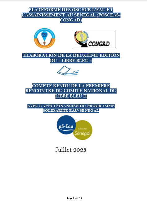 rapport Jul 2023 ; 11 pages Aut. Khadidiatou Ba Ndiaye Ed. pS-Eau - Paris Téléchargeable sous format: PdF Sommaire: Compte-rendu de l'atelier de lancement de la démarche d'actualisation du Libre Bleu Sénégal. Cette séance était organisée en partenariat avec avec le CONGAD et la POSCEAS en juillet 2023. Publics-Cibles: Association , Tout public , Acteurs de coopération , Décideurs locaux ou nationaux