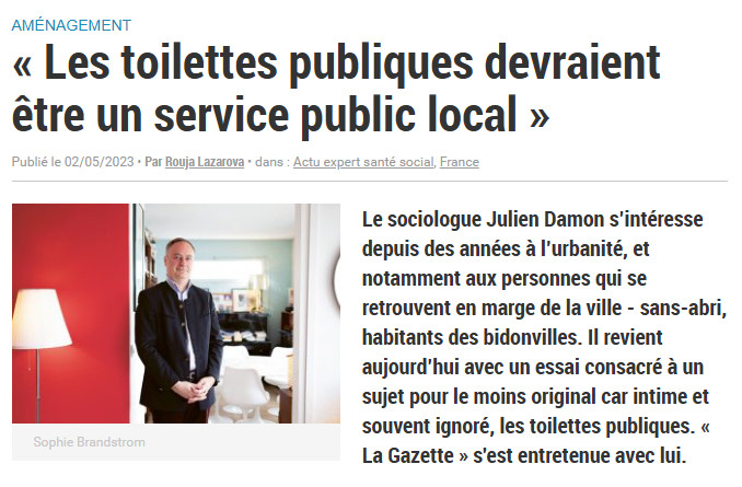 article de presse May 2023 ; 1 pages Aut. Julien Damon Ed. La Gazette des Communes - Paris Téléchargeable chez l'éditeur Résumé: Julien Damon s’intéresse depuis des années à l’urbanité, et notamment aux personnes qui se retrouvent en marge de la ville – sans-abri, habitants des bidonvilles. Il revient aujourd’hui avec un essai consacré à un sujet pour le moins original car intime et souvent ignoré, les toilettes publiques : « Toilettes publiques. Essai sur les commodités urbaines » (Les Presses de Sciences-po, mars 2023). Ce sont ses observations sur les sans-domicile qui l’ont conduit à s’intéresser à la thématique, car « il est extrêmement compliqué de conserver une dignité humaine quand l’on n’a pas accès aisément aux waters ».
