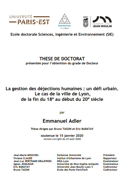 thèse Aug 2020 ; 348 pages Aut. Emmanuel Adler Ed. Université Paris-Est Sup - Marne-la-Vallée Téléchargeable sous format: PdF Téléchargeable chez l'éditeur Résumé: Inspirée par l’exercice d’une longue activité professionnelle dans le domaine de l’assainissement, et plus particulièrement dans l’épuration des eaux usées domestiques, cette thèse a pour objet d’apporter un éclairage sur les conditions de gestion des déjections humaines dans une double réflexion technique et historique. La problématique étudiée porte sur les conditions d’évolution des systèmes d’assainissement des villes développés par les êtres humains pour gérer leurs matières excrémentielles et les soustraire à leur environnement immédiat. Il s’agit d’étudier plus précisément les moyens adoptés pour procéder à l’éloignement des déjections humaines. Le sujet est appréhendé depuis les premiers équipements destinés à recueillir les matières solides et liquides, en passant par les conduites et les fosses de stockage, jusqu’aux opérations logistiques d’extraction, de déplacement et de transformation, pour conclure sur la victoire du tout-à-l’égout. Soulevant le voile sur la part de secret qui caractérise tout ce qui touche aux déjections humaines, ce travail tente d’apporter un éclairage nouveau sur ce secteur d’importance, en particulier dans un contexte d’économie circulaire et de transition énergétique. Sur l’échelle de temps d’une part, si la période retenue pour orienter les investigations conduites est relativement longue, couvrant la fin du XVIIIe jusqu’au début du XXe s., c’est parce qu’elle permet d’appréhender l’essor d’une activité aux multiples connexions (techniques, scientifiques, politique publique, justice…). Cet intervalle caractérise une radicale transformation des activités de gestion des déjections humaines produites par les habitants des grandes villes. Dans une progression rythmée par des tensions et des crises, le système d’évacuation des déjections humaines de la cité se structure en réseau, contrôlé par un nombre croissant d’acteurs, mais également de procédés techniques, de règlementations, et bien sûr pour en assurer le fonctionnement, de mécanismes financiers. Second point déterminant d’autre part, après l’ancrage chronologique et dans le contexte très centralisateur de la France, la recherche porte géographiquement un intérêt marqué pour la ville de Lyon, qui bénéfice d’un contexte particulier par rapport à Paris, avec la présence du Rhône, et qui est restée jusqu’ici relativement peu considérée sous l’angle des déjections humaines. Pour rendre digeste un sujet caractérisé par la profusion de données et la diversité de systèmes, hier et aujourd’hui, un découpage parmi d’autres a été adopté. Après l’analyse des enjeux techniques, puis des aspects liés à la santé, la thèse aborde les aspects juridiques et financiers de la gestion des matières. A la suite, motivé par une formation d’ingénieur agronome, le travail se poursuit avec la question du devenir des déjections, et plus précisément leurs conditions de retour au sol. La conclusion cherche à mettre en évidence que les conditions d’éloignement des déjections humaines en milieu urbain se complexifient au fil du temps, avec la mise en œuvre d’opérations supplémentaires de séparation de phases, et la victoire du tout-à-l’égout au XXe siècle.