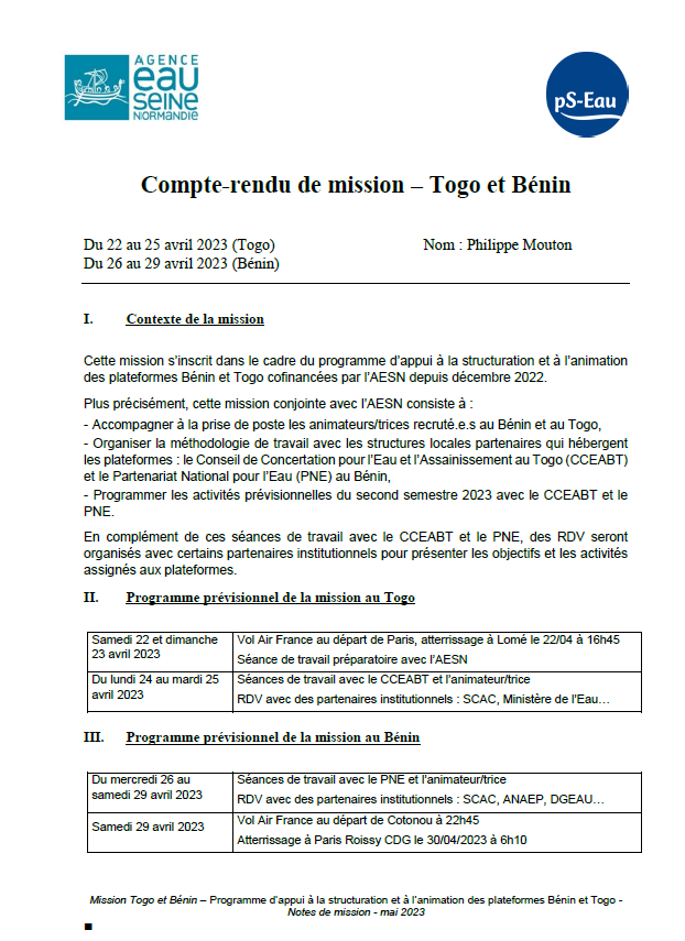 - Organiser la méthodologie de travail avec les structures locales partenaires qui hébergent les plateformes : le Conseil de Concertation pour l’Eau et l’Assainissement au Togo (CCEABT) et le Partenariat National pour l’Eau (PNE) au Bénin,
