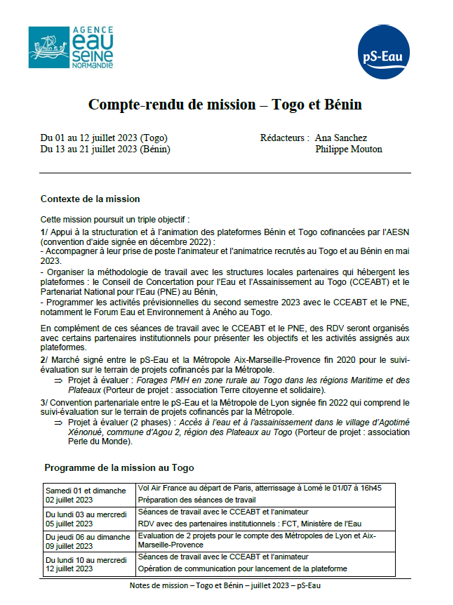 rapport Sep 2023 ; 13 pages Ed. CCEABT - Lomé pS-Eau - Paris REAGIRE - Cotonou Résumé: Cette mission poursuit un triple objectif : 1/ Appui à la structuration et à l’animation des plateformes Bénin et Togo cofinancées par l’AESN (convention d’aide signée en décembre 2022) : - Accompagner à leur prise de poste l’animateur et l’animatrice recrutés au Togo et au Bénin en mai 2023. - Organiser la méthodologie de travail avec les structures locales partenaires qui hébergent les plateformes : le Conseil de Concertation pour l’Eau et l’Assainissement au Togo (CCEABT) et le Partenariat National pour l’Eau (PNE) au Bénin, - Programmer les activités prévisionnelles du second semestre 2023 avec le CCEABT et le PNE, notamment le Forum Eau et Environnement à Aného au Togo. En complément de ces séances de travail avec le CCEABT et le PNE, des RDV seront organisés avec certains partenaires institutionnels pour présenter les objectifs et les activités assignés aux plateformes. 2/ Marché signé entre le pS-Eau et la Métropole Aix-Marseille-Provence fin 2020 pour le suivi-évaluation sur le terrain de projets cofinancés par la Métropole. - Projet à évaluer : Forages PMH en zone rurale au Togo dans les régions Maritime et des Plateaux (Porteur de projet : association Terre citoyenne et solidaire). 3/ Convention partenariale entre le pS-Eau et la Métropole de Lyon signée fin 2022 qui comprend le suivi-évaluation sur le terrain de projets cofinancés par la Métropole. - Projet à évaluer (2 phases) : Accès à l’eau et à l’assainissement dans le village d’Agotimé Xénonué, commune d’Agou 2, région des Plateaux au Togo (Porteur de projet : association Perle du Monde).