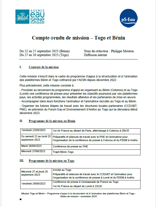 rapport Oct 2023 ; 5 pages Ed. CCEABT - Lomé pS-Eau - Paris REAGIRE - Cotonou Résumé: Cette mission s’inscrit dans le cadre du programme d’appui à la structuration et à l’animation des plateformes Bénin et Togo cofinancé par l’AESN depuis décembre 2022. Plus précisément, cette mission consiste à : - Procéder au lancement du programme d’appui en organisant au Bénin (Cotonou) et au Togo (Lomé) une conférence de presse pour présenter les objectifs poursuivis par ces plateformes pays, les activités programmées, les résultats attendus et les partenaires de mise en œuvre. - Accompagner dans leurs fonctions l’animateur et l’animatrice recrutés au Togo et au Bénin. - Organiser les futures étapes de travail avec les structures locales partenaires (CCEABT, PNE), en prévision du Forum Eau et Environnement d’Aného au Togo qui se déroulera début décembre 2023