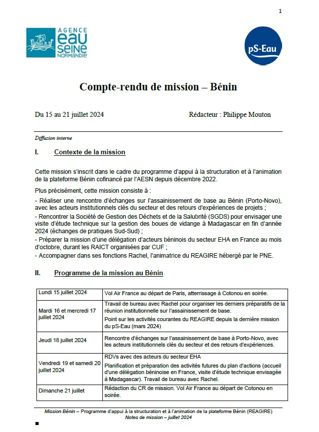 rapport Jul 2024 ; 6 pages Ed. pS-Eau - Paris REAGIRE - Cotonou Résumé: Cette mission s’inscrit dans le cadre du programme d’appui à la structuration et à l’animation de la plateforme Bénin cofinancé par l’AESN depuis décembre 2022. Plus précisément, cette mission consiste à : - Réaliser une rencontre d’échanges sur l’assainissement de base au Bénin (Porto-Novo), avec les acteurs institutionnels clés du secteur et des retours d’expériences de projets ; - Rencontrer la Société de Gestion des Déchets et de la Salubrité (SGDS) pour envisager une visite d’étude technique sur la gestion des boues de vidange à Madagascar en fin d’année 2024 (échanges de pratiques Sud-Sud) ; - Préparer la mission d’une délégation d’acteurs béninois du secteur EHA en France au mois d’octobre, durant les RAICT organisées par CUF ; - Accompagner dans ses fonctions Rachel, l’animatrice du REAGIRE hébergé par le PNE.