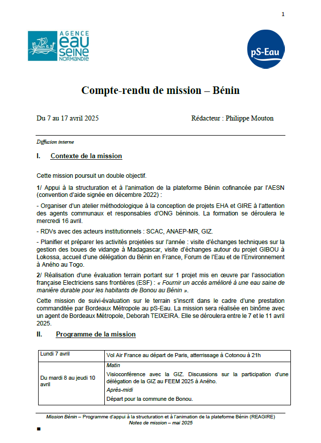 rapport Apr 2025 ; 7 pages Ed. pS-Eau - Paris REAGIRE - Cotonou Résumé: Cette mission poursuit un double objectif. 1/ Appui à la structuration et à l’animation de la plateforme Bénin cofinancée par l’AESN (convention d’aide signée en décembre 2022) : - Organiser un atelier méthodologique à la conception de projets EHA et GIRE à l’attention des agents communaux et responsables d’ONG béninois. La formation se déroulera le mercredi 16 avril. - RDVs avec des acteurs institutionnels : SCAC, ANAEP-MR, GIZ. - Planifier et préparer les activités projetées sur l’année : visite d’échanges techniques sur la gestion des boues de vidange à Madagascar, visite d’échanges autour du projet GIBOU à Lokossa, accueil d’une délégation du Bénin en France, Forum de l’Eau et de l’Environnement à Aného au Togo. 2/ Réalisation d’une évaluation terrain portant sur 1 projet mis en œuvre par l’association française Electriciens sans frontières (ESF) : « Fournir un accès amélioré à une eau saine de manière durable pour les habitants de Bonou au Bénin ». Cette mission de suivi-évaluation sur le terrain s’inscrit dans le cadre d’une prestation commanditée par Bordeaux Métropole au pS-Eau. La mission sera réalisée en binôme avec un agent de Bordeaux Métropole, Deborah TEIXEIRA. Elle se déroulera entre le 7 et le 11 avril 2025.