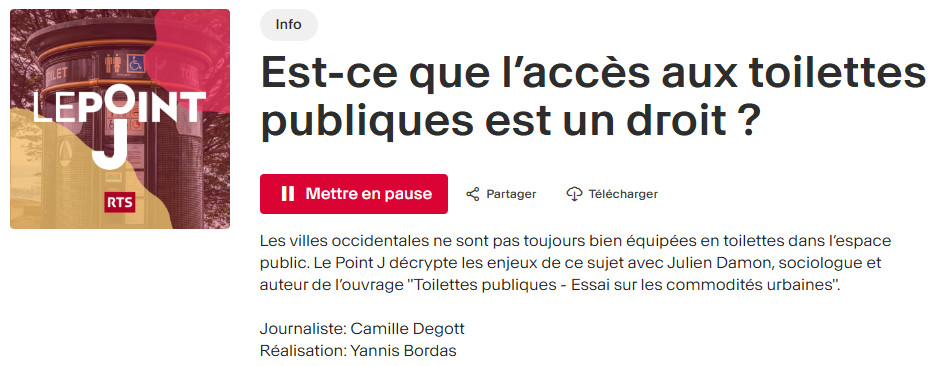 audio Feb 2026 ; Durée: 14 min. Aut. Julien Damon Ed. RTS - Genève Téléchargeable sous format: Audio MP3 (30 ko) Téléchargeable chez l'éditeur Résumé: Les villes occidentales ne sont pas toujours bien équipées en toilettes dans l’espace public. Le Point J décrypte les enjeux de ce sujet avec Julien Damon, sociologue et auteur de l’ouvrage "Toilettes publiques - Essai sur les commodités urbaines".
