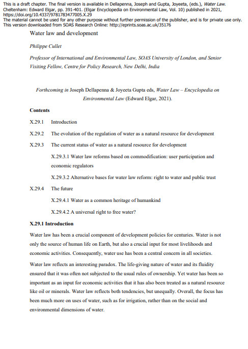 article Aug 2021 ; 10 pages Aut. Philippe Cullet Ed. Current Science - Downloadable format: PdF Downloadable from the publisher Resumen: This chapter examines water law in a global South-global North context. It looks at the recent evolution of water law, divided between a push for recognising water as an economic good that can be traded like any other commodity and a counter push for enshrining the commons nature of water through the public trust doctrine and the recognition of the human right to water. It then considers necessary steps for the future of water law, including the recognition of water as a common heritage and the need to reconceive the right to water as a right to free water. Contents: X.29.1 Introduction X.29.2 The evolution of the regulation of water as a natural resource for development X.29.3 The current status of water as a natural resource for development X.29.3.1 Water law reforms based on commodification: user participation and economic regulators X.29.3.2 Alternative bases for water law reform: right to water and public trust X.29.4 The future X.29.4.1 Water as a common heritage of humankind X.29.4.2 A universal right to free water?