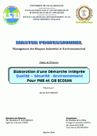 Mémoire dans le cadre d'un Master professionnel en management des risques industriel et environnemental thèse Oct 2008 ; 82 pages Aut. Karim Savadogo Ed. Université de Ouagadougou - Joseph Ki Zerbo - Ouagadougou Téléchargeable sous format: PdF Résumé: Le présent mémoire a pour objectif principal d'établir le diagnostic initial en matière de management Qualité, Sécurité et Environnement du projet Ecosan UE, d'identifier et caractériser les processus. Aussi, il définit les exigences légales et réglementaires, nationales et internationales. Un manuel Qualité, Sécurité et Environnement (planification, moyens/procédures/outils de mise en œuvre, suivi et contrôle des résultats, actions correctives et préventives, amélioration) a été proposé pour offrir un cadre de travail efficace au PME et GIE qui voudrait faire de l'assainissement écologique un business. Publics-Cibles: