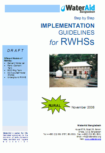 rapport Nov 2002 ; 66 pages Ed. WaterAid - Dhaka WaterAid - London Téléchargeable sous format: PdF Téléchargeable chez l'éditeur Abstract: Step by step implementation guidelines for Rainwater Harvesting Systems in rural areas.