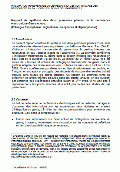 Le présent rapport constitue la synthèse des deux premières phases d'une série de conférences électroniques organisées par l'Alliance Genre et Eau (GWA) s'intitulant « Intégration transversale du genre dans la gestion intégrée des ressources en eau : quelles leçons de l'expérience ?». La première conférence « Intégration transversale du genre dans la gestion intégrée des ressources en eau : état de la question » a eu lieu du 28 janvier au 24 février 2002, et a été suivie de « Succès et échecs de l'intégration transversale du genre dans la gestion intégrée des ressources en eau - Études de cas » du 8 avril au 31 mai 2002. Quatre conférences parallèles ont eu lieu simultanément, en anglais, en français, en espagnol et portugais. Les résumés de chacune d'entre elles ont été traduits dans toutes les autres langues. Ce rapport de synthèse tente de présenter les divers thèmes discutés dans les quatre langues, en les illustrant par certaines des expériences diffusées durant le 2ème cycle. Il ne vise pas à reprendre tous les points abordés et n'inclut pas toutes les études de cas présentées.